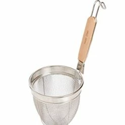 - Made from stainless steel mesh with sturdy wire frame; wooden handle with 2 hooks conveniently hangs on the pot while in use and stores away easily