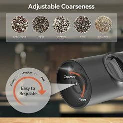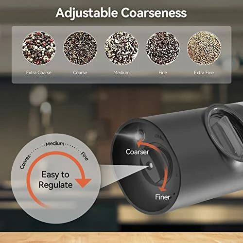 - ?【Many Adjustable Coarseness】Turn the electric pepper grinder knob at the bottom of the device to adjust the coarseness you like. It can ground into fine particles by rotating clockwise, and coarse particles by rotating counterclockwise, suitable for sea salt, black pepper, gold pepper, white pepper and other solid spices.