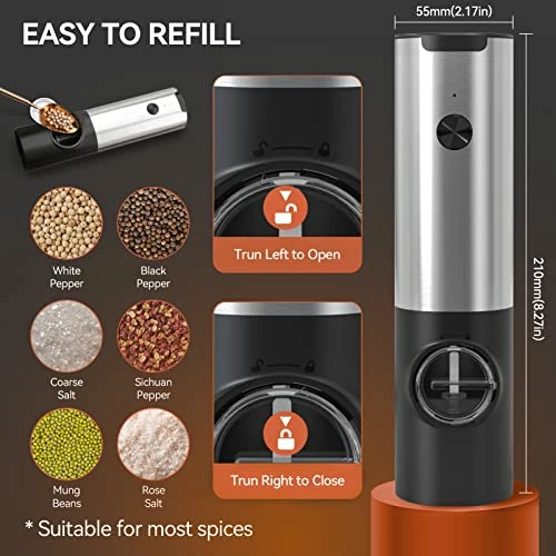 - ?【LED light & Low Noise】Automatic salt pepper grinders with white LED light for brighter and clearer, light will turn on whenever the salt pepper grinder set is working, so it helps prevent food from being over-seasoned. Also, pepper mill grinder doesn’t exceed 60 db when in use.