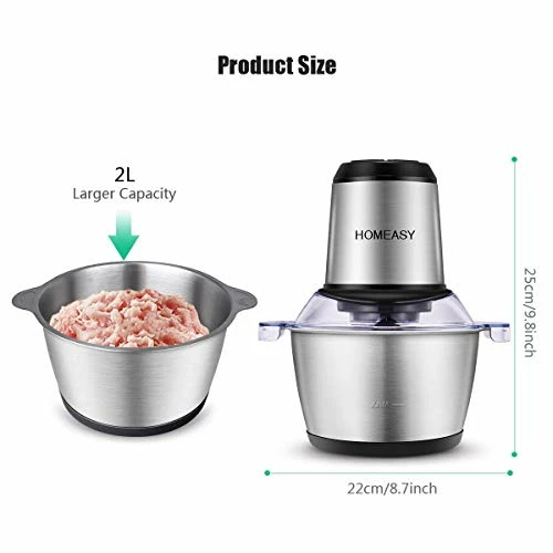 - βLARGE CAPACITY AND DURABILITY – HOMESAY mini chopper is equipped with a stainless steel bowl and 2L capacity. Compared with glass bowls, it is stronger, healthier and shock-proof, ensuring durability. The joint connection between blade and the main body is made of stainless steel unlike other plastic one thus the blade is not easy to break off.