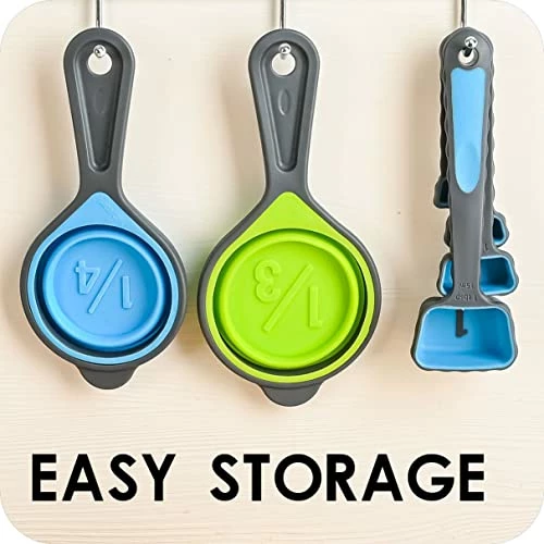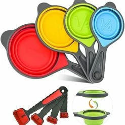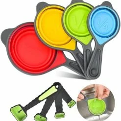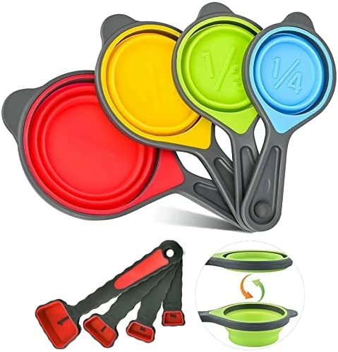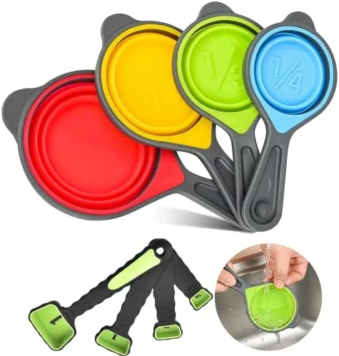 - β±β±Collapsible measuring cups 4 pack (1 Cup, Β½ Cup, 1/3 Cup, ΒΌ Cup) and 4 collapsible measuring spoons (1/4 teaspoon, 1/2 teaspoon, 1-teaspoon, 1-tablespoon), Accurate measuring cups and spoons available anywhere you go! Designed to fit in any places.