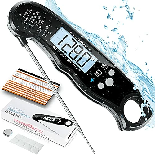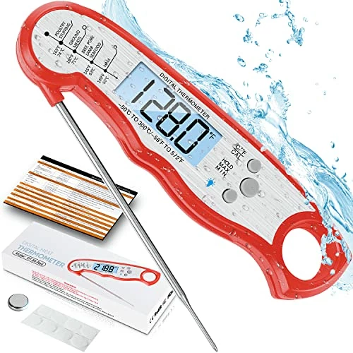 - 【Ultra Fast & Accurate Reading】 The meat thermometer’s probe head measures only 1.7mm in diameter, making it easy to introduce it into meats. Keeping it in food for 2-4 seconds, you’ll get the accurate temperature (±1°C/2°F). Whether to fry beef steaks, grill pork, deep fry fish/potatoes, or for an outdoor BBQ, this thermometer gives you accurate temp reference.