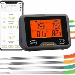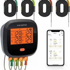 The IBBQ-4T WiFi thermometer. I found it a bit tricky to initially set up to my WiFi router, be sure to follow instructions carefully, I had to set mine to only allow the 2.4 band while setting up so that my phone and the thermometer were using the same band. After the setup I could return the WiFi to normal. The color coded thermometer probes are really handy. I wasnβt able to make the data graphs work in the app. Do not confuse this model with others that may be water resistant – the IBBQ-4T is Not Water Resistant. Otherwise a great grilling thermometer for the money.