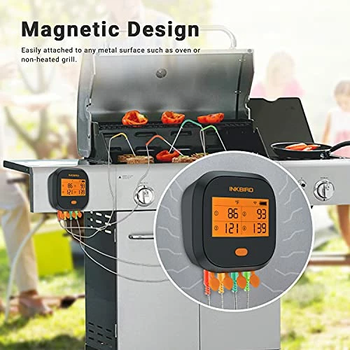 - β γMagnet Design and 4 Colored ProbesγThe magnetic design of this wireless grill thermometer make it possible to adsorb on the surface of household appliances like ovens, refrigerators or other metal surfaces near it.An awesome wifi Kitchen thermometer for smoker, oven. 4 colored probes help customers dping barbecue more convenient.