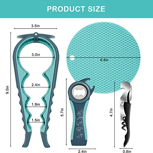 - Packaging information – You will receive a 4- in- 1 Jar opener, a 5-in-1 Bottle operer, a 3- in- 1 Wine opener and Non Slip Jar Opener Gripper Pad, These tools can be easily stored or hung anywhere without regular maintenance, reusable and useful, It is an indispensable multifunctional kitchen tool in life, enough to meet your daily family needs; it can also be used as a great gift for parents, grandparents, girlfriends, other colleagues and friends.