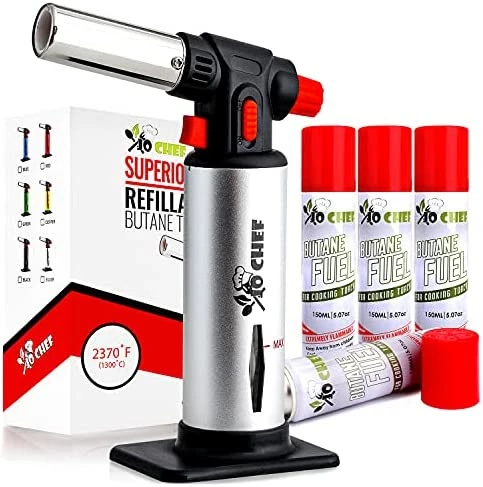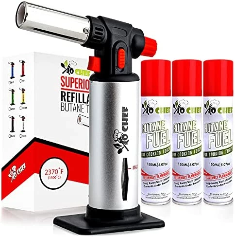 - KITCHEN TORCH WITH 2 BUTANE CANS INCLUDED – Take your meal prep to the next level with the Jo Chef Superior RX Butane Torch. Your NEW kitchen torch comes with 2 butane fuel refill canisters so you can use it right out the box! The adjustable flame reaches temperatures up to 2,370Β°F.
