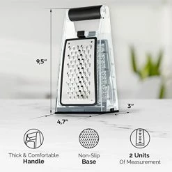 - Cheese Grater With Storage Container And Measurements. The smart base of this potato grater saves you time and space by storing your freshly grated food, while the clear sides provide two units of measurement: cups and milliliters. There’s no messy kitchen, no need for extra utensils to grate into or measuring devices. The non-slip base and thick handle provide grip and comfort.
