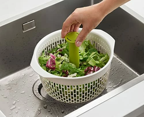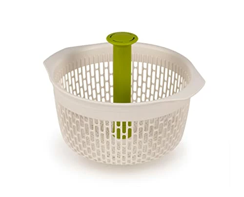 This clever design combines the features of a salad spinner and a colander in one, thereby saving you precious cupboard space. For preparing salads, simply attach the spindle and suction cup to the basket, add the food and rinse as normal under the tap. Next fix the colander to the base of the sink with the suction cup and then pump the spindle up and down to rotate the basket and expel the excess water. To use as a conventional colander, simply remove the spindle and suction cup and hold using the side handles. When finished, the spindle and suction cup fit neatly together for easy storage. Dishwasher safe.
