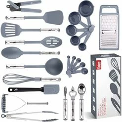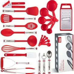- Cooking Utensils Set Includes: Soup Ladle, Solid Spoon, Slotted Spoon, Solid Turner, Slotted Turner, Potato Pusher, Can Opener, Whisk, Grater, Spatula, Tongs, Ice Scream Scooper, Wine Opener Peeler,Measuring Cups, Measuring Spoons.