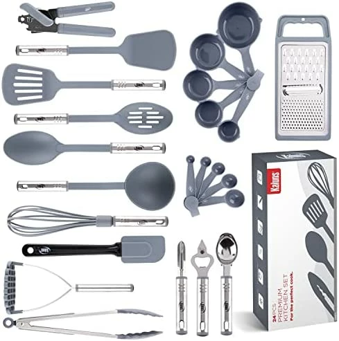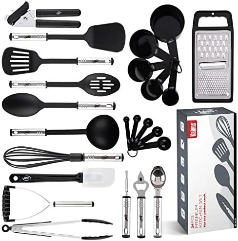 - Kitchen Utensil Set: Our utensil sets have everything you need for a perfect cooking experience! Kaluns kitchen gadgets and accessories are made of a combination of nylon and stainless steel to ensure no scratching or sticking.