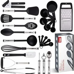 - Great Value Nylon and Stainless Steel Utensil set : Don’t spend a fortune buying each utensil individually. Buy yourself a complete kitchen tool set. Our 24 peice high quality set has everyting you need included. It is specifically designed to help you with all your food preparations, such as whisking, peeling, cutting, stirring, mixing, basting, baking, grilling, frying and serving up that perfect dish.