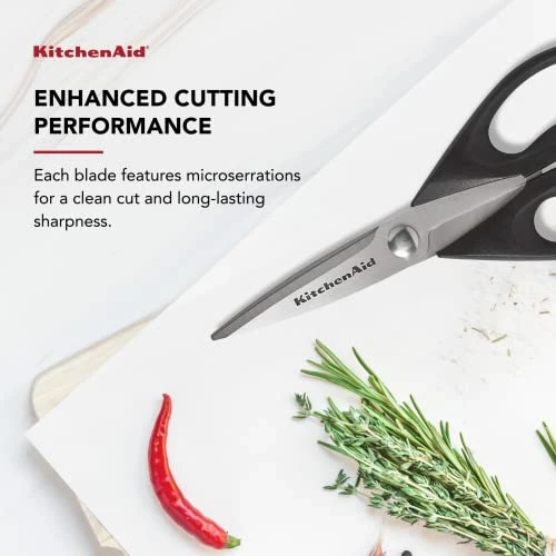 - ENHANCED BLADES: The micro-serrations on the blade edges of these kitchen scissors provide a superior cutting experience on everything from tough cuts of meat to strong wires and twine