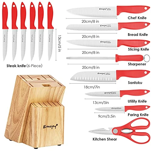 - γA BEST GIFTγEmojoy was born for everyone loving cooking.Our knife set with block is more like every chef’s best partner for any of your cooking needs. For the one you cared about, Emojoy kitchen knife sets with block it’s also a wonderful wedding gift for your friends or Mother’s Day οΌbirthdayοΌhousewarmingοΌThanksgivingοΌChristmas and any other events.