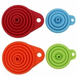 I have a tough time pouring without spilling and these CUTE and FUNCTIONAL funnels that come in 4 sizes are fantastic. AND THEY COLLAPSE down into almost flat items that fit in my measurement items drawer !! And they will fit on a prong in the dishwasher saving space and serving as a soft buffer for glass items as well.