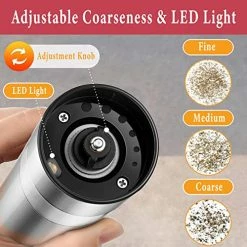 - ? Adjustable Coarseness — The electric salt and pepper grinder set allowing you to choose between a powdery fine to very coarse grind. and the electric pepper grinder mechanism produces even grinds at each coarseness setting.