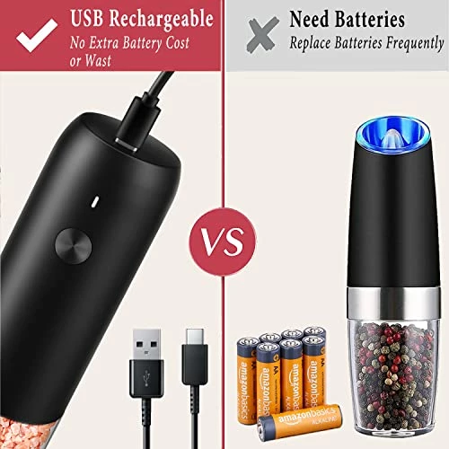 - ? USB Rechargeable — Unlike other manual or AAA battery operated pepper mill. this electric pepper grinder built-in a rechargeable 500mAh Lithium Battery, You won’t have to spend extra money on batteries like other battery powered grinders, or worry about adding to landfill. Letting you charge anywhere without the hassle of replacing the battery.