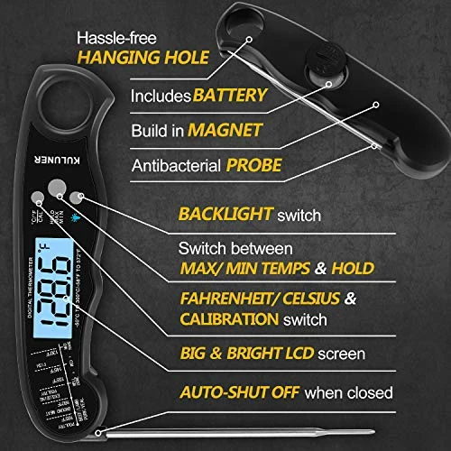 - γSO EASY TO USEγWorks right out the box! KULUNER digital thermometer with foldable 4. 6″ Food grade stainless steel probe and auto-on/off function, open the probe to turn on, fold the probe to turn off.EASY to use, storage and carry. With the included battery you can start using the thermometer right away. Itβs the perfect solution for grilling, baking, deep frying, making candy, or uses it to test the temperature of your Liquid, beer, wine, tea, coffee, milk, soup, etc.