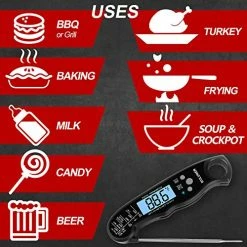 - γPOWERFUL FUNCTIONALITYγSwitch easily between β and β, and the large and bright LCD display with backlight makes it very easy to read the temperature while cooking outdoors on sunny days or at night. Easy to calibrate, comes beautifully packaged in a premium foam lined box, making it an ideal present for any cooking or bbq enthusiast.Also includes 1 extra CR 2032 battery, bonus a meat temperature chart that allows you to effortlessly cook mouthwatering meals.