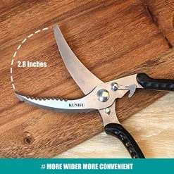 - Long Blades and Safety Lock – The KUNIFU poultry shears blade length is 5.1″, comparing to general blades with 3.9″. Each cut could be further, easier and more efficient. The safety lock will make sure the sharp blades stay veiled when it’s not being used, it enhance the safety, and keep blades sharp as well. Easy to unlock before use.