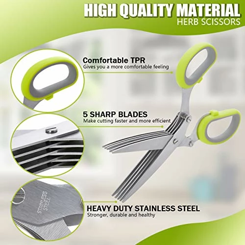 - βοΈγSave Time and Hassleγ- Our heavy duty scissors Adapt to a large number of cutting many kinds of herbs and vegetables such as mint, chives, celery. Do not need chopping boards and choppers, bring kitchen work more convenience. Two snips with sharp, finely balanced 10 food-grade blades increase your productivity by 5 times.