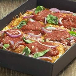 Lloyds Pans have the best designs, sturdy quality, and stick resistant coating. Great Detroit style pan. Made sturdy like the original – I swear I could drive a truck over this. Upgraded with a superior stick resistant anti scratch coating. Important for the detroit style burnt cheese. With a thin coat of shortening, the crust and cheese are crisp, the pizza slides out easy, and you could almost clean it out with a paper towel. No seasoning necessary. Love this pan!