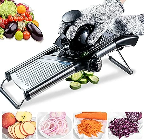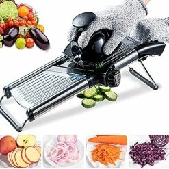 - Mandoline Slicer with Protective Tools: VEKAYA designed all the slicing options built-in the mandoline slicer. Rotating the switch to change the cutting options, you do no need to touch the blade-ever. Also VEKAYA have a safe hand holder and a pair of cutting resistance gloves in this mandoline slicer set to protect you from any injury.