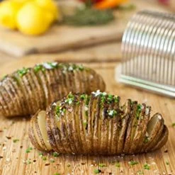 My new favorite kitchen tool! This Hasselback potato slicer works like a dream! Perfect slices in under a minute!Great for the microwave or oven β¦I zap the potatoes in the microwave for a few minutes and then a hot oven to crisp up the skins basting with butter once or twice. Ready for a dollop of sour cream and sprinkle of chives ,salt and fresh ground pepper or where your taste buds take you. I just ordered 4 more for gifts!