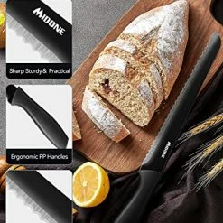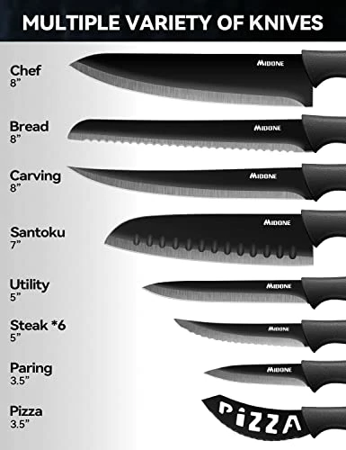- ALL-IN-ONE KNIFE SET – MIDONE 17-piece kitchen knife set meets all cutting needs, includes: 1 PCS 8″ Chef knife, 1 PCS 8″ Carving knife, 1 PCS 8″ Bread knife, 1 PCS 7″ Santoku knife, 1 PCS 5″ Utility knife, 1 PCS 3.5″ Paring knife, 6 PCS 4.5β Steak knives, 1 PCS Pizza knife and scissors, peeler, knife sharpener and acrylic stand.