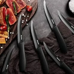 - FOOD-GRADE CARBON BASED COATING – The surface of the knife is High polymer precision coating developed by Dr. Takahashi, refuse stains or pitting. The ergonomically designed serrated steak knife makes the meat cut smoother and taste more delicious. Gives you an incredible taste bud experience!
