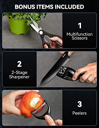 - MODERN STYLING YET CLASSIC DESIGN – Easy to clean and store, the knife set is equipped with a sharpener, peeling scissors and acrylic. After use, wash your knives by hand, and immediately wipe the knives with a soft, dry cloth or paper towel until there are no water stains.