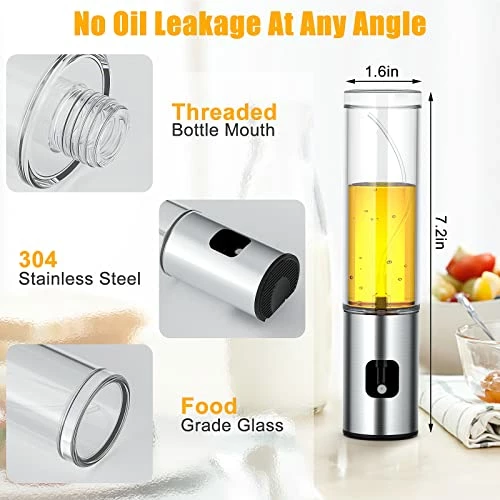 - DESIGN: The material of the oil spray bottle is food-grade glass and 304 stainless steel, there is anti-slip texture on the top of the bottle cap, which makes it’s easy to pump and control the oil usage, the dustproof atomizing nozzle is hidden inside of the cap, efficiently keep it clean.