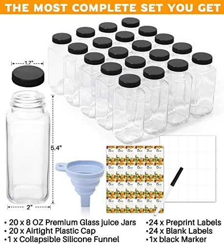 - 【Package Includes】holds 8oz/250ml, comes in a safe package of 20, 2″ Width x 5.4″ Height, with airtight lids, 48 sticky labels, 1 funnel, 1 maker. Space saving square shape, storage option for all liquids, oils and sauces, works well for spices, herbs and dry goods. Great for using as a fermentation jar to make your own drink.