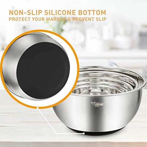 - ? [EASY MEASURE & NON-SLIP] Quarts and liters are clearly engraved inside the bowls and fade proof, meet the demand of different measurement. A silicone non-slip bottom keeps the stainless bowls steady on counter tops when beating and whisking. Users can mix, beat, or whisk ingredients with little mess as the wide, deep bowls have high walls to prevent splatter.