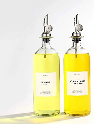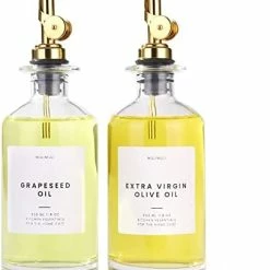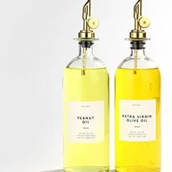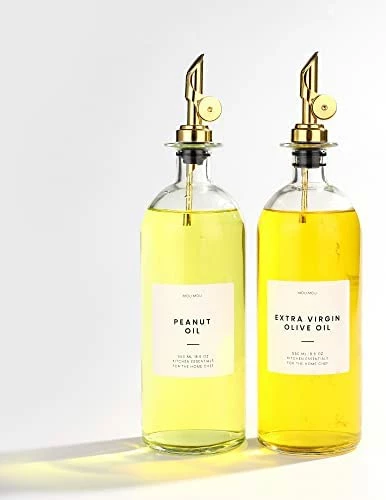 - Modern Kitchen Essential: Minimalism Inspired Cooking Oil Dispenser Bottle. This Set Includes Two High-quality 11.8 Oz (350 Ml) Glass Bottles, Two Gold Pourers, a funnel, and a 37 Label Set.