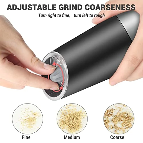 - ?【ADJUSTABLE ROUGHNESS】Gravity automatic salt and pepper grinder with an adjustable grinder so you can adjust the thickness of spice, salt or pepper. A variety of grinding levels are available for you to choose from, allowing you to grind the spices from coarse to fine grinding.