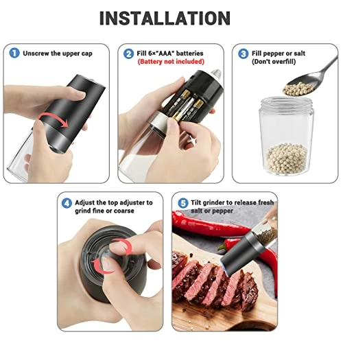 - ❤️【HIGH QUALITY & LARGE CAPACITY】Electric pepper and salt mill grinder have a large and wide spice container, no need to add spice frequently. The acrylic body and the adjustable ceramic blade make the grinder more wear-resistant and durable. The simple and stylish design is the perfect complement to every kitchen, and it is also a great gift.