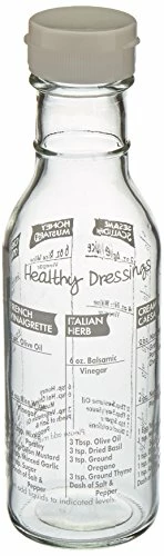 I eat an ultra-healthy diet and I try to avoid inflammatory foods at all costs. Recently I happened to glance down at my usual salad dressing brand’s label and that’s when I noticed it: the first/main ingredient is Soybean Oil. Soybean Oil is an Omega-6 oil (Omega-3 is considered good, Omega-6 oil is not at all good, especially if you consume a large quantity of 6’s as compared to 3’s). So despite the great price of my usual brand of salad dressing, I decided I was going to start making my own dressings.This product is ADORABLE! It has several DIY recipes for salad dressing which includes ratios of oils, vinegars and spices – right on the bottle! It is durable. The top is easy to open/close and it does not leak. It is easy to fill and easy to clean.My husband saw it and asked me to order a few more so that we can have several different flavors of healthy dressing available in the fridge at all times.