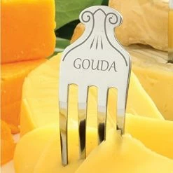 - Stainless steel with engraving of six kinds of frequently used cheeses: brie, chevre, cheddar, Gouda, Swiss and Bleu