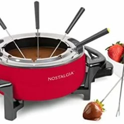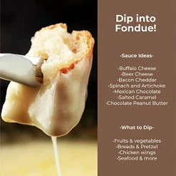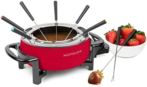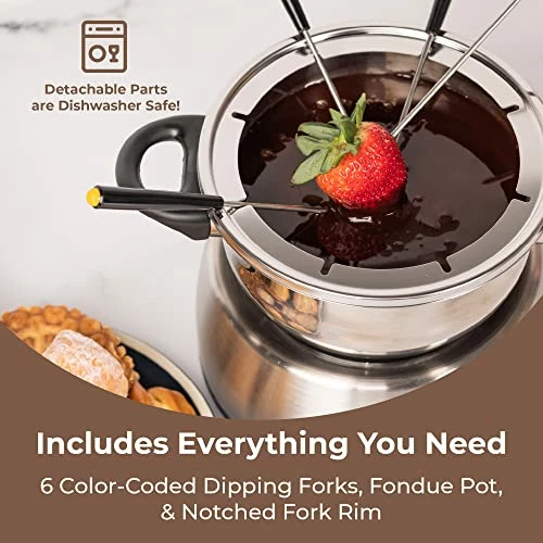 I ordered this fondue pot for our condo kitchen because I like to serve cheese fondue for an easy dinner option. I use a premixed fondue that is nearly identical to the ones Iβve eaten in Germany including the white wine! I just cut the foil bag open and slide the cheese into the pot which I set on #4 heat indicator. By the time Iβve made up our salad and cut the french baguette the cheese is melted.I set the heat to #2 and we have dinner! So simple.I used the pot today to melt the chocolate for my freshly made biscotti. Worked like a charm! I did have to used a small spatula ( think large butter knife) to spread the chocolate on the bottom of each biscotti since mine are too long to dip in the pan. I had no scorching issues or boiling water from a double boiler to deal with when I was finished. I seat the heat at #3 to melt and turned it down to #2 for spreading.The included forks are identical to the ones Iβve had previously