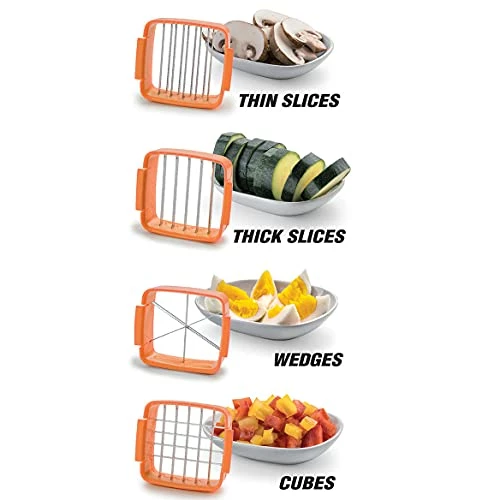 Does not cut like shown in the pictures. Onions need to be in smaller pieces, maybe 1/8th at a time. Other than that, it works fine on small sized items.