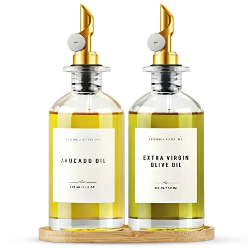 - Perfect Oil Dispenser Set – Includes 2 pack 11.8oz (350ML) glass bottles, 2 pack gold weighted pourers, 2 pack collapsible silicone funnels, a bamboo tray, and 20 premium waterproof labels.