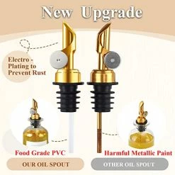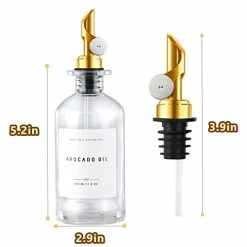 - Thoughtful Design – The olive oil dispenser gold weighted is automatically opened when pouring down and closed when pouring up vertically without manual closing. Free up your hands while you’re busy cooking. Each set of oil bottles comes with 20 high-quality waterproof labels that can be reused many times and do not leave any residue when removed.