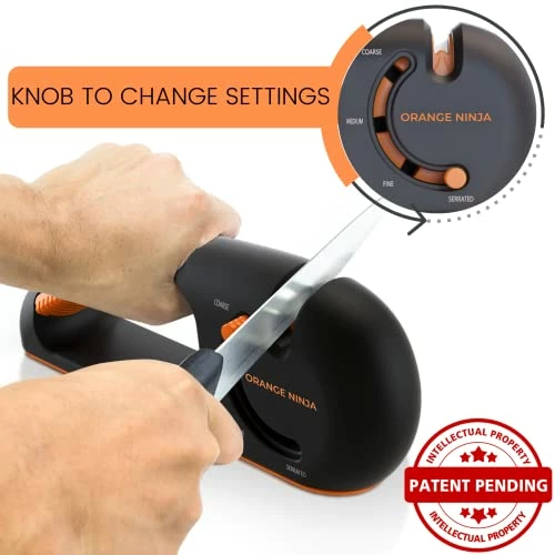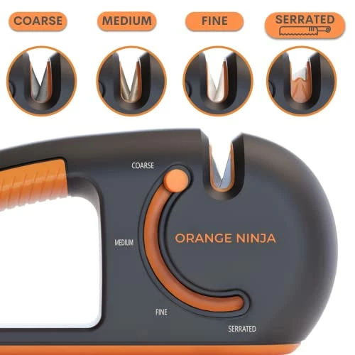 - ?Razor Sharp Edge: Orange Ninja kitchen knife sharpener, can quickly and easily sharpen a wide variety of knives. Knife Sharpening is done in three steps (coarse, medium, fine) for knives. All it takes is a few simple strokes to keep your kitchen knives razor-sharp.