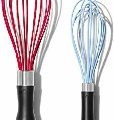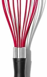 I ordered this to replace an old whisk that had worn out. I really like the color and the thickness of the handle – I like that the handle is covered in soft silicone so it’s comfortable to hold. The silicone whisk prongs are good and do mix well, wish they were a little sturdier as they can bend when mixing, depending what consistency you’re working with. I made cheese sauce with this for homemade mac and cheese and this held up well to the thick sauce. It also didn’t scratch my nonstick pans. Price is fair for the quality.