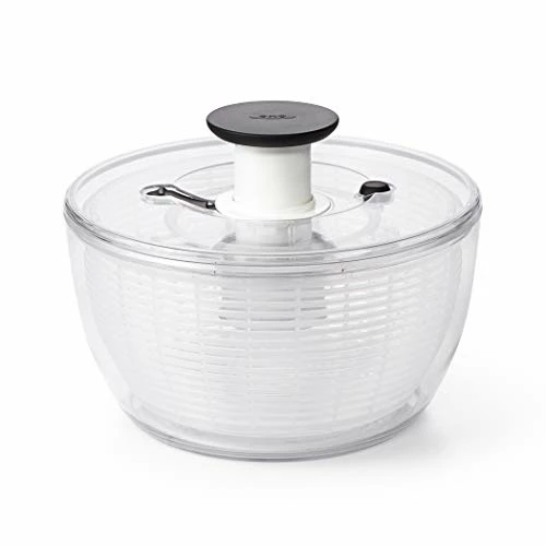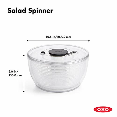 A new spin on our classic design Before the introduction of the OXO Good Grips Salad Spinner in 1998, crank or pull-tab salad spinners were considered high-end products. Some people even used the spin cycle of their washing machine to dry lettuce. Our easy-to-use Spinner transformed the tool into an everyday kitchen essential. Nearly 20 years later, we revisited the Spinner to make some updates while keeping the top features and original inspiration: a childrenβs top. With a modern design that complements contemporary kitchens and an improved brake that stops on a dime every time, we think youβll love our new spin on the classic design. Dry salad greens with a simple press of the soft, non-slip knob. The non-slip base keeps the bowl steady on the countertop, and the updated built-in brake button stops the Salad Spinner for unloading. The basket doubles as a colander, and the lid comes apart for easy cleaning.