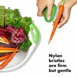 I am a huge fan of OXO products, and this veggie cleaning brush is perfect! It makes it easy to clean your potatoes, carrots (I leave the skins on for more nutrients) and other items with ease and comfort. You can also use it to scrub or scour other items if you wish as the bristles are sturdier than other like items I have owned but not so rough that it will peel the skins off either.The shape is easy to hold and does not slip out of the hand.Recommended.