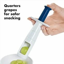 The handy OXO Tot Grape Cutter cuts grapes into quarters quickly and easily. This super safe gadget features a soft, non-slip plunger with curved finger rests for comfort while cutting and premium serrated blades that easily slice through fruits.