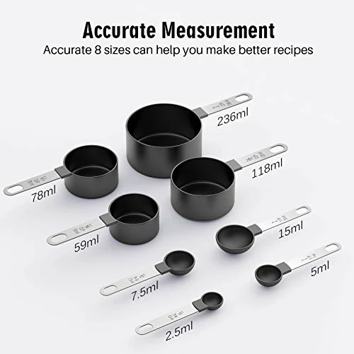 - γPrecise Scale & VolumeγThe stainless steel handles are engraved with visible standard metric units to ensure that you are using the correct measurements. Comes with 8 different sizes of cups to satisfy your daily needs. 1 cup(236ml), 1/2 cup(118ml), 1/3 cup(78ml), 1/4 cup(59ml), 1 tbsp( 15ml), 1/2 tbsp(7.5ml), 1 tsp(5ml), 1/2 tsp(2.9ml)