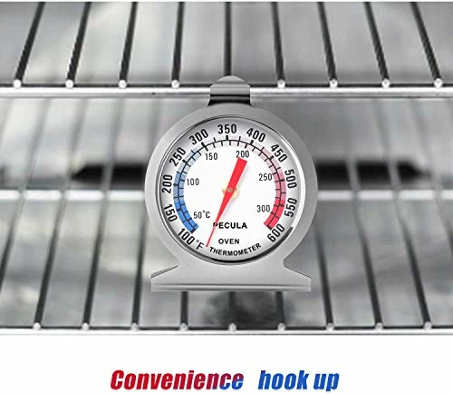 - Nice design: our oven thermometer has a hook and panel design, so it can be hung or stood for easy installation in different places, mechanical thermometer reads instantly and without the need for battery power.