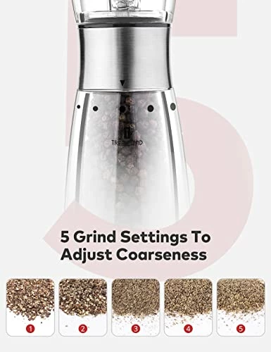 - ?Consistent Fine Grind: With 5 grinding settings for adjustable coarseness, this pepper grinder mill and stable grind design make quick smooth work. (Note salt and pepper not included.)